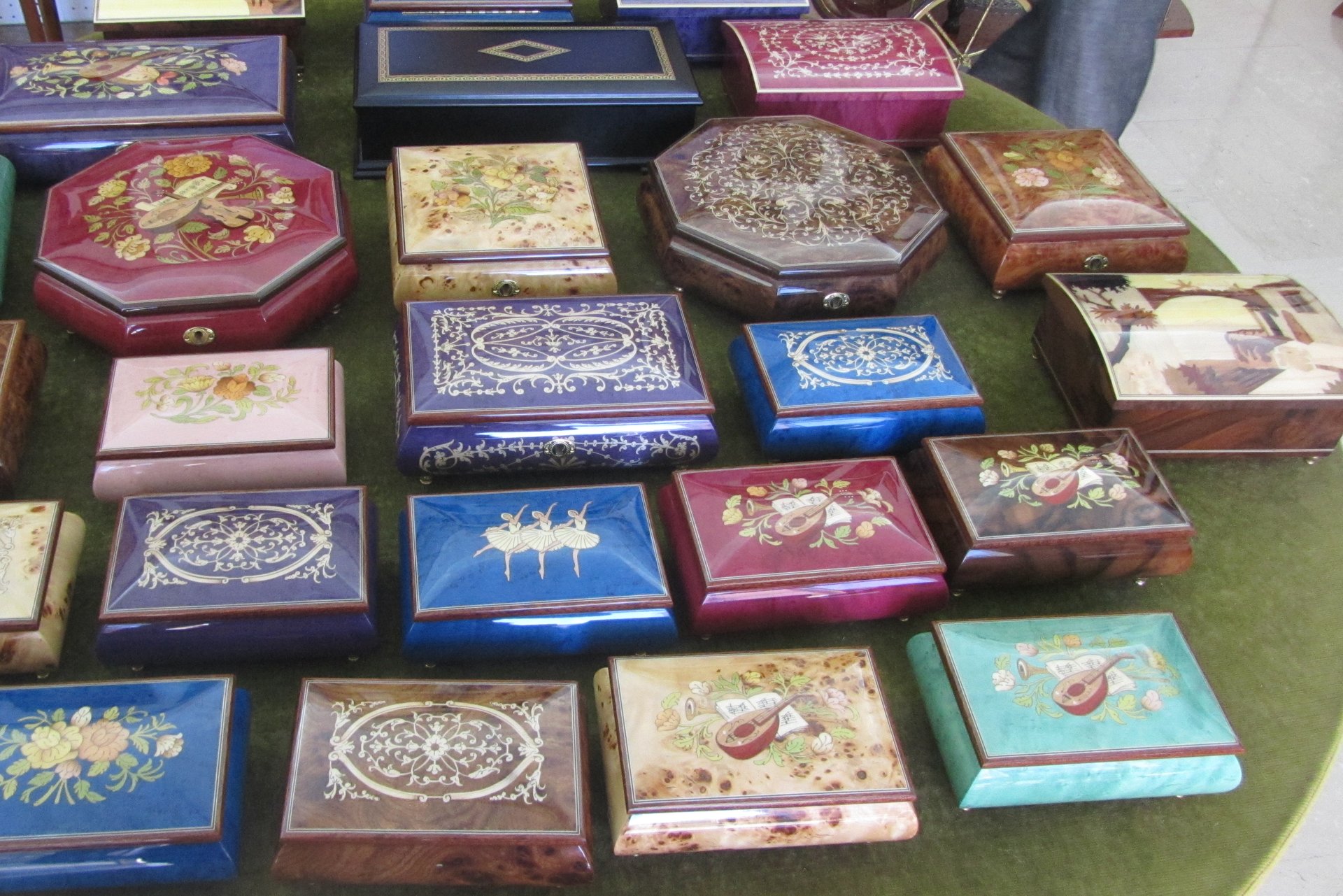 Die Themen die dort dargestellt werden sind Landschaft, Natur, lokale Produkte, Abschnitte der lokale Geschichte und Mythen. Die Technik der Marketerie besteht aus der Realisation von Bildern auf den Oberflächen des Holzes mit Zusammenbau von kleinen Holzteilen, vorher geschnitten und geformt. Die Holzteile haben verschiedene Farben und sind dünner als 1 mm. Sie erhalten die Schattierung dank dem Schnitt und dem Eintauchen in den warmen Sand. Der letzte Schritt bei der Realisierung eines Artefakts besteht aus dem Zusammenbau der Holzteile, die mit Fischleim geklebt, dann geschliffen und zuletzt lackiert werden.